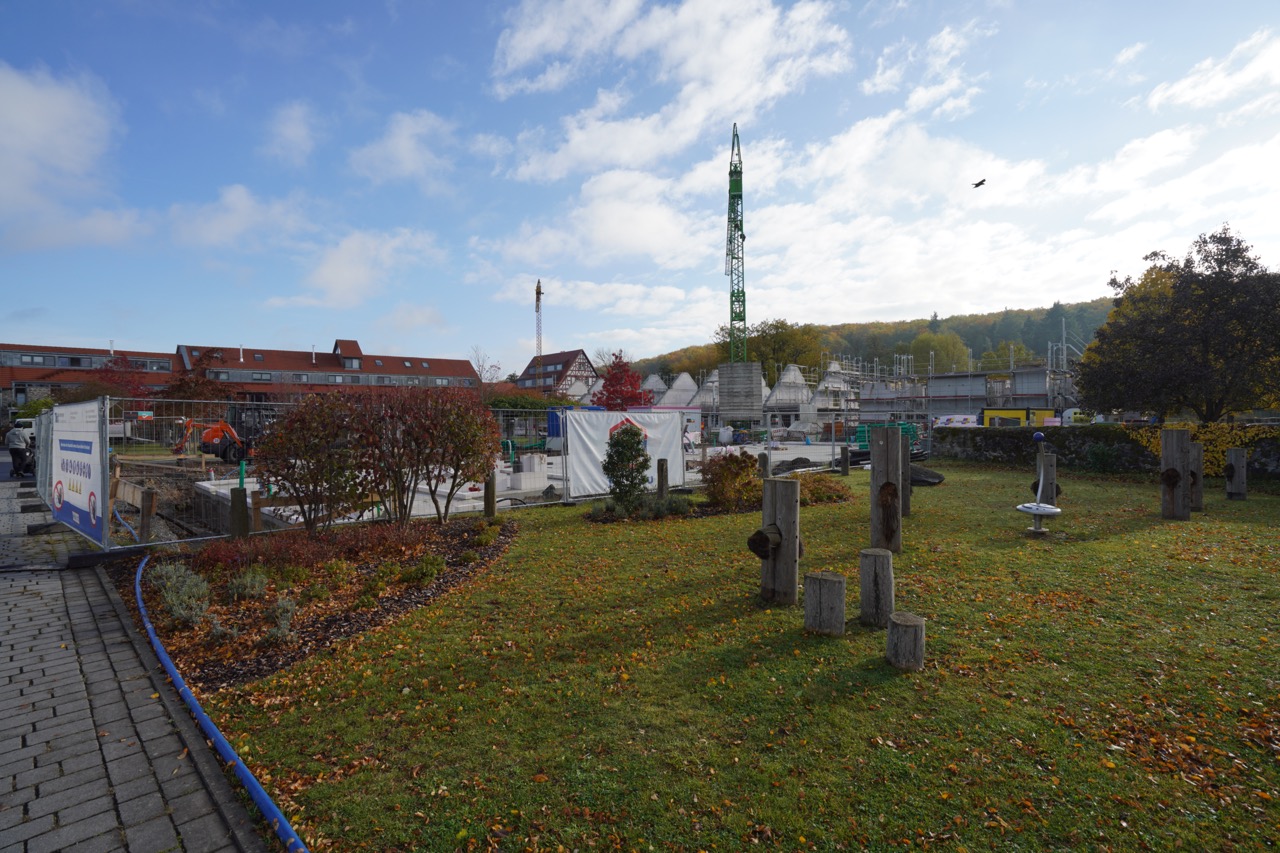 Wohngebäude mit gestufter Dachabfolge sind im Westen und im